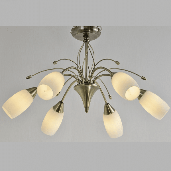 Konstrukcja lampy w kolorze patyny. Klosze szklane mleczne.