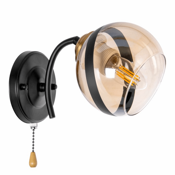 Kinkiet jest osadzony na solidnej metalowej konstrukcji w kolorze czarnym. Posiada niepowtarzalny szklany klosz w kolorze miodowym, owinięty czarnym paskiem który nadaje niepowtarzalnego klimatu.
