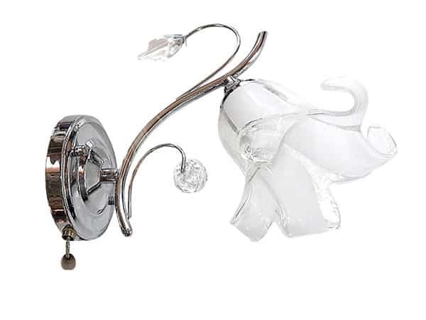 Konstrukcja lampy wykonana jest z metalu w kolorze chromu. Klosz wykonany ze szkła w kolorze mlecznym imitujący pęk kwiatu.