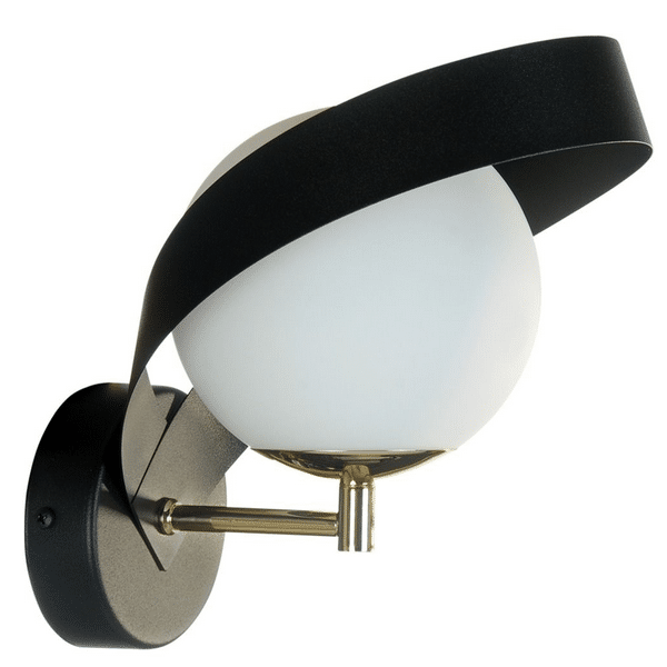 Konstrukcja metalowa w kolorze czarnym z dodatkami złotymi. Klosz szklany biały.