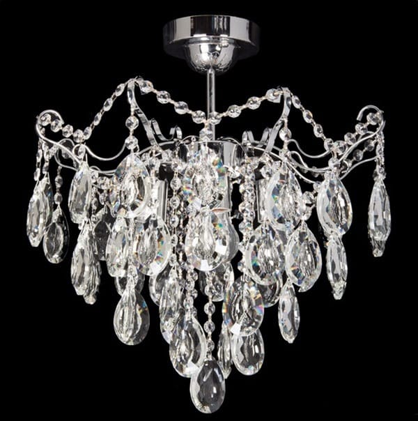 Elementy metalowe w kolorze błyszczącego chromu. Kryształ przeźroczysty.