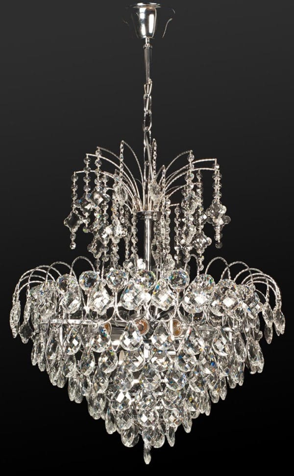 Elementy metalowe w kolorze błyszczącego chromu. Kryształ przeźroczysty.