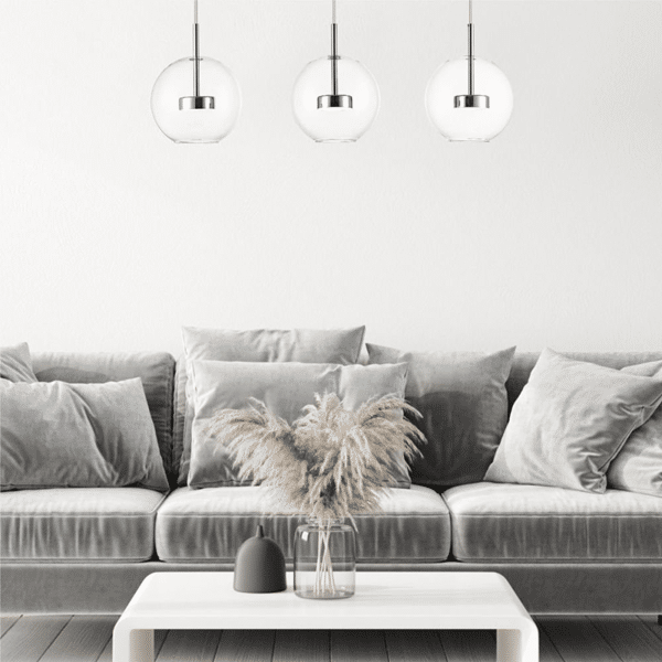 Konstrukcja lampy w kolorze srebrna. Klosz szklany.