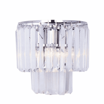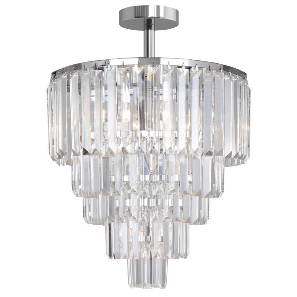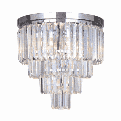Konstrukcja lampy wykonana z metalu w kolorzechromu. Kryształy szklane przeźroczyste.
