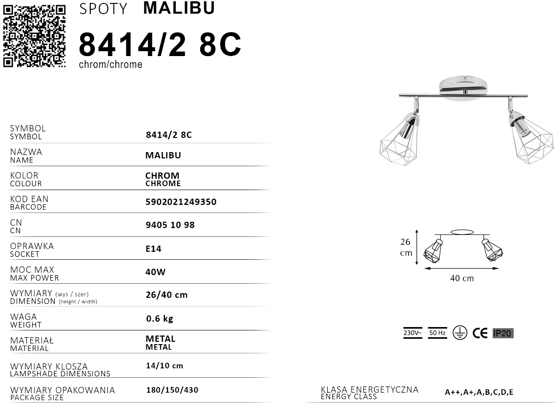 Lampa sufitowa podłużna chromowa 2 punktowa MALIBU 8414 8C