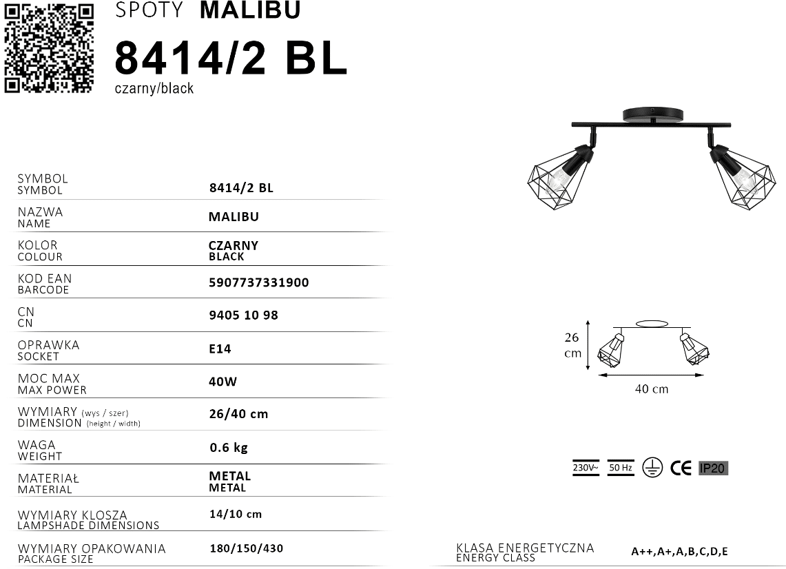 Lampa sufitowa podłużna czarna 2 punktowa loft MALIBU 8414/2 BL