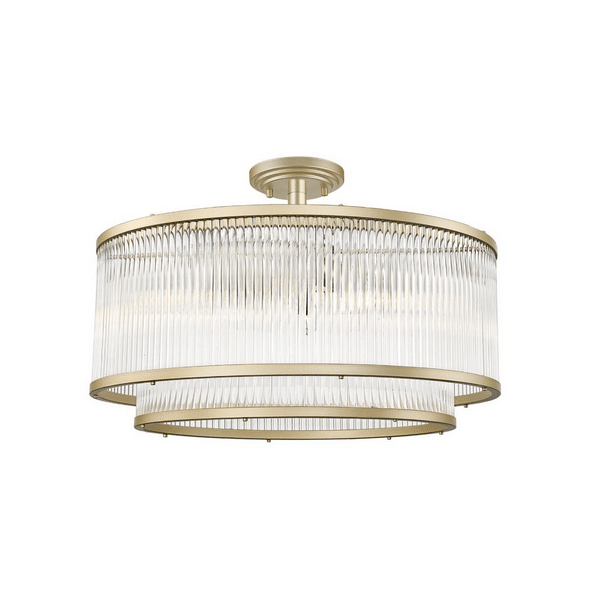 Konstrukcja lampy w kolorze złotym. Słupki szklane.