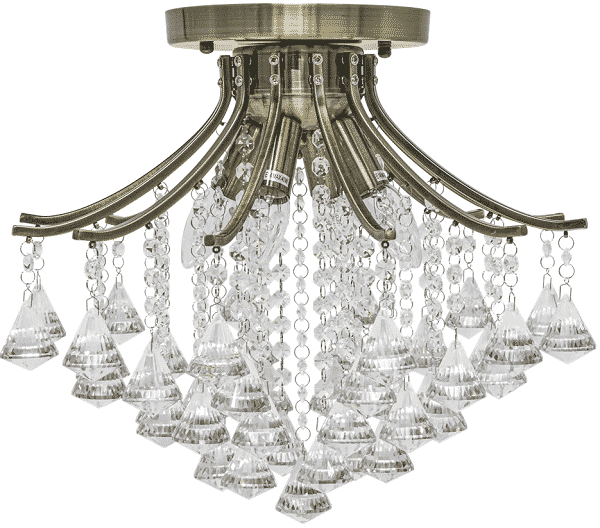 Konstrukcja lampy wykonana z metalu w kolorze mosiądzu. Kryształki szklane w kształcie stożka.