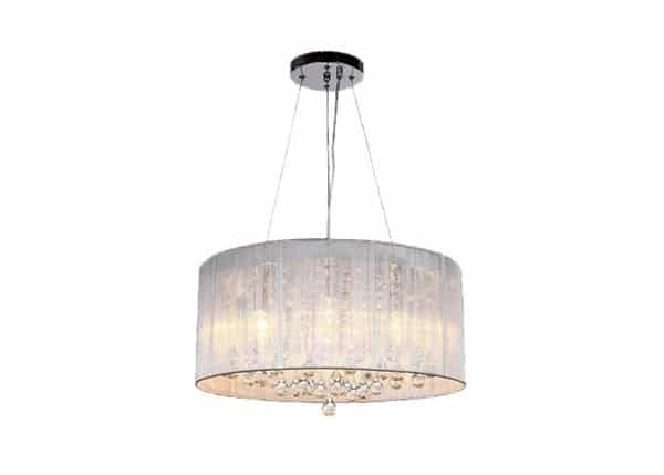 Konstrukcja lampy w kolorze błyszczącego chromu. Abażur nitkowy srebrny. Lampę zdobią łezki szklane.