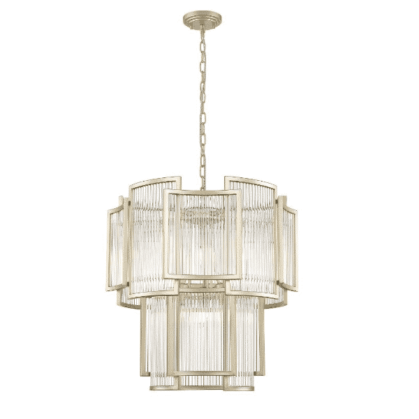 Konstrukcja lampy wykonana z metalu w kolorze złotym. Elementy dekoracyjne wykonane ze szkła.