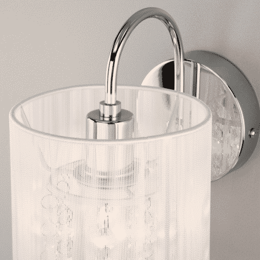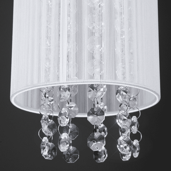 Konstrukcja lampy w kolorze błyszczącego chromu. Abażur nitkowy biały. Lampę zdobią łańcuszki kryształowe.