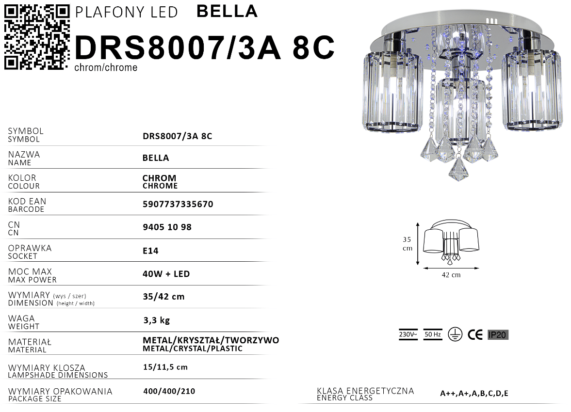 Plafon LED kryształowy 3X40W chom pilot DRS8007/3A 8C BELLA