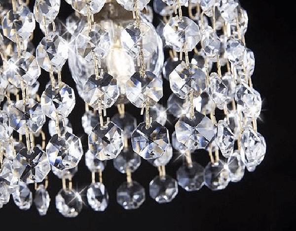 Konstrukcja lampy w kolorze złota. Lampę zdobią łańcuchy kryształowe.