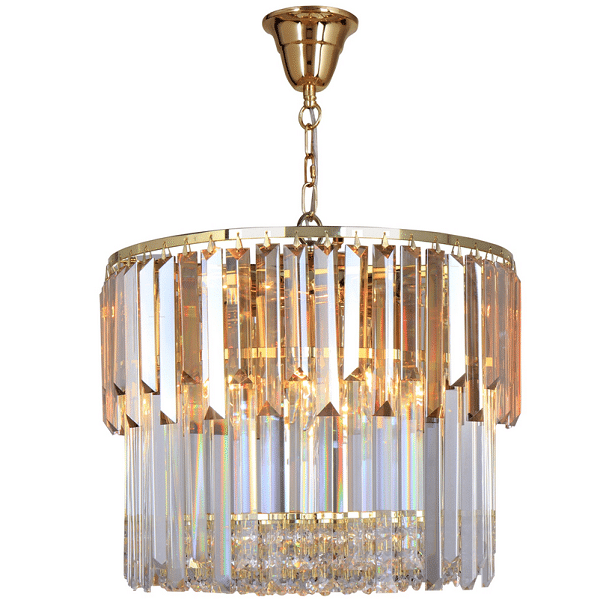 Konstrukcja lampy wykonana z metalu w kolorze złota. Kryształy szklane.