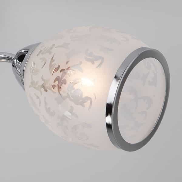 Konstrukcja lampy w kolorze błyszczącego chromu. Klosz szklany piaskowany z motywem kwiatowym.